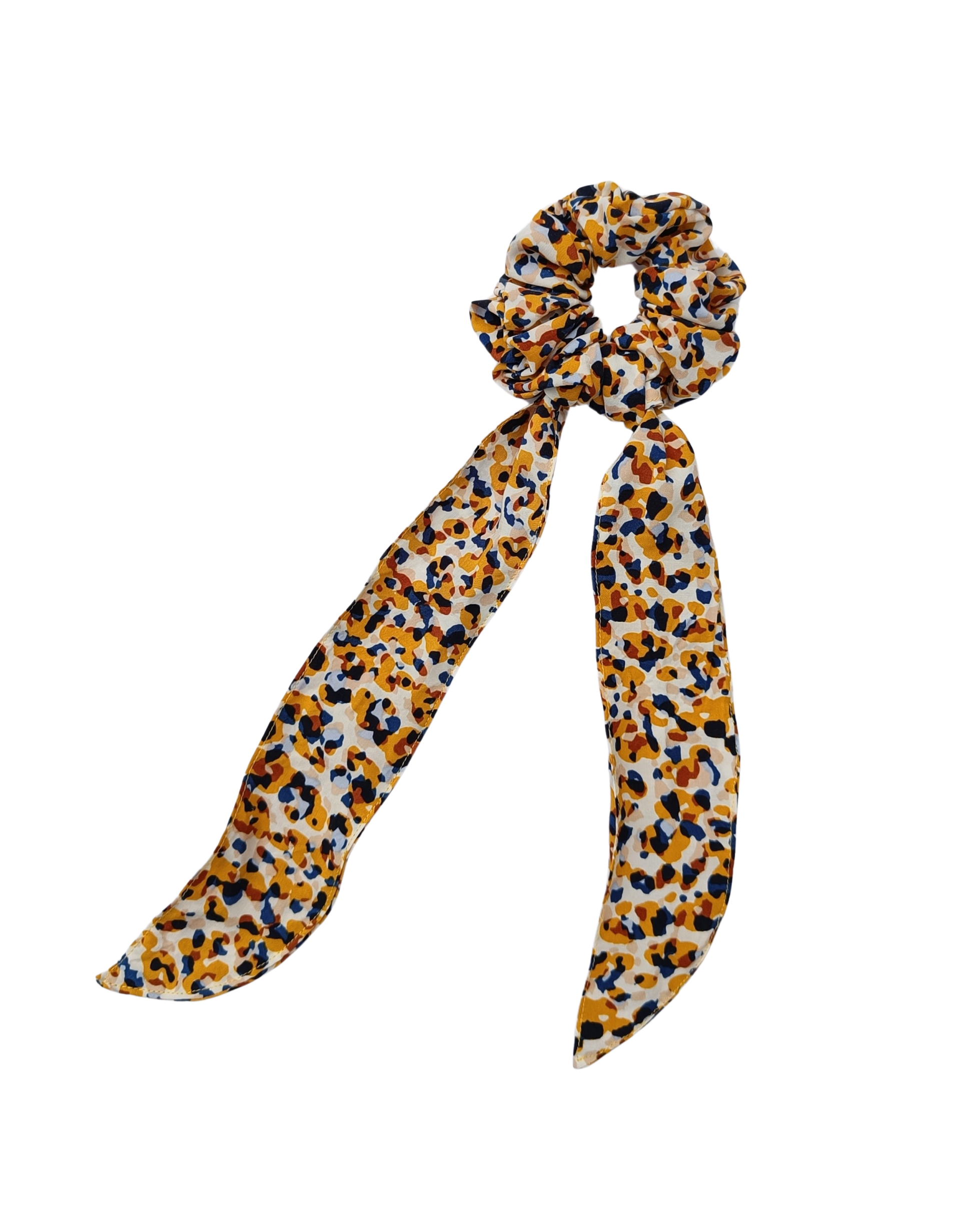 Scrunchie met lint – okergeel-blauw en wit abstract motief