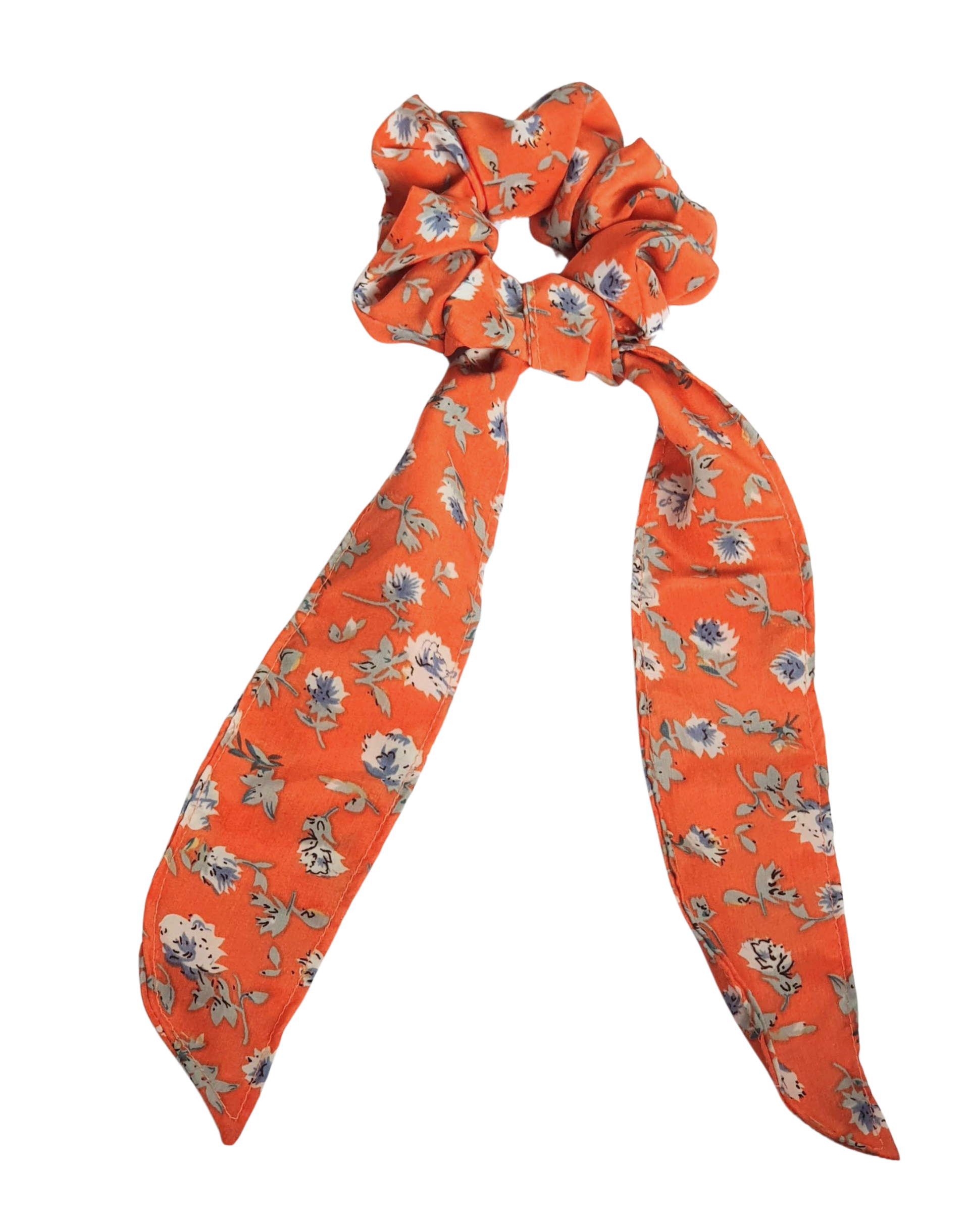 Deze vrolijke scrunchie is gemaakt van een oranje stof met een speels bloemenmotief en komt met een lint dat je zelf kunt knopen of losmaken. Draag hem met lint voor een romantische touch, of zonder voor een meer basic look. Twee stijlen in één dus!