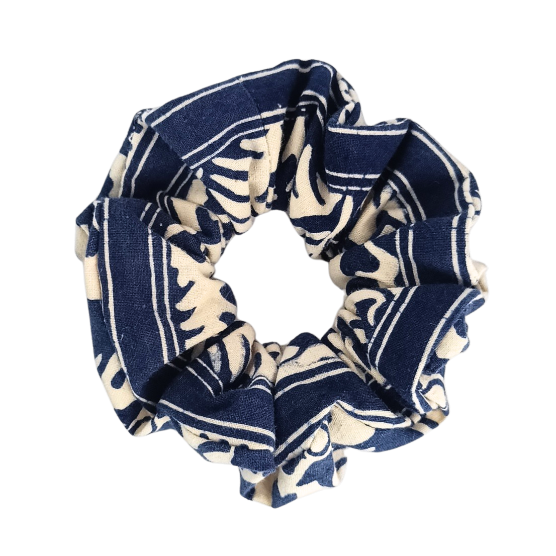 Een scrunchie met karakter! Deze variant in normale maat is gemaakt van een prachtige batikstof in donkerblauw met wit. Deze scrucnhie heeft 2 verschillende zijden. De stof heeft een levendig patroon en een handgemaakte uitstraling, waardoor elke scrunchie nét even anders is. Een echte blikvanger voor in je haar of om je pols.