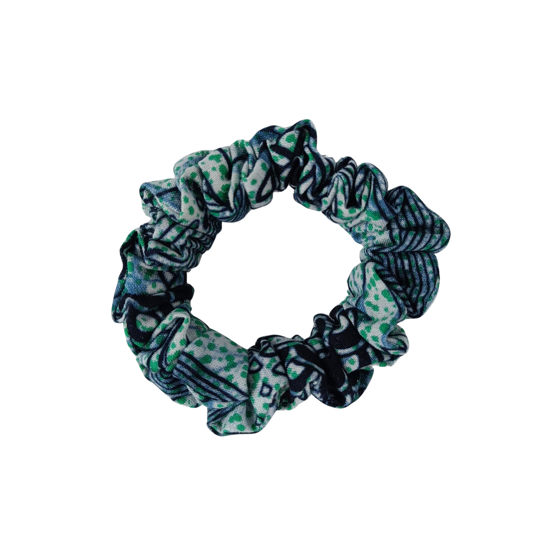 Turquoise batik – een levendig patroon met karakter, gemaakt van batik katoen. Door het batikproces is elke scrunchie uniek: het patroon valt telkens net iets anders.