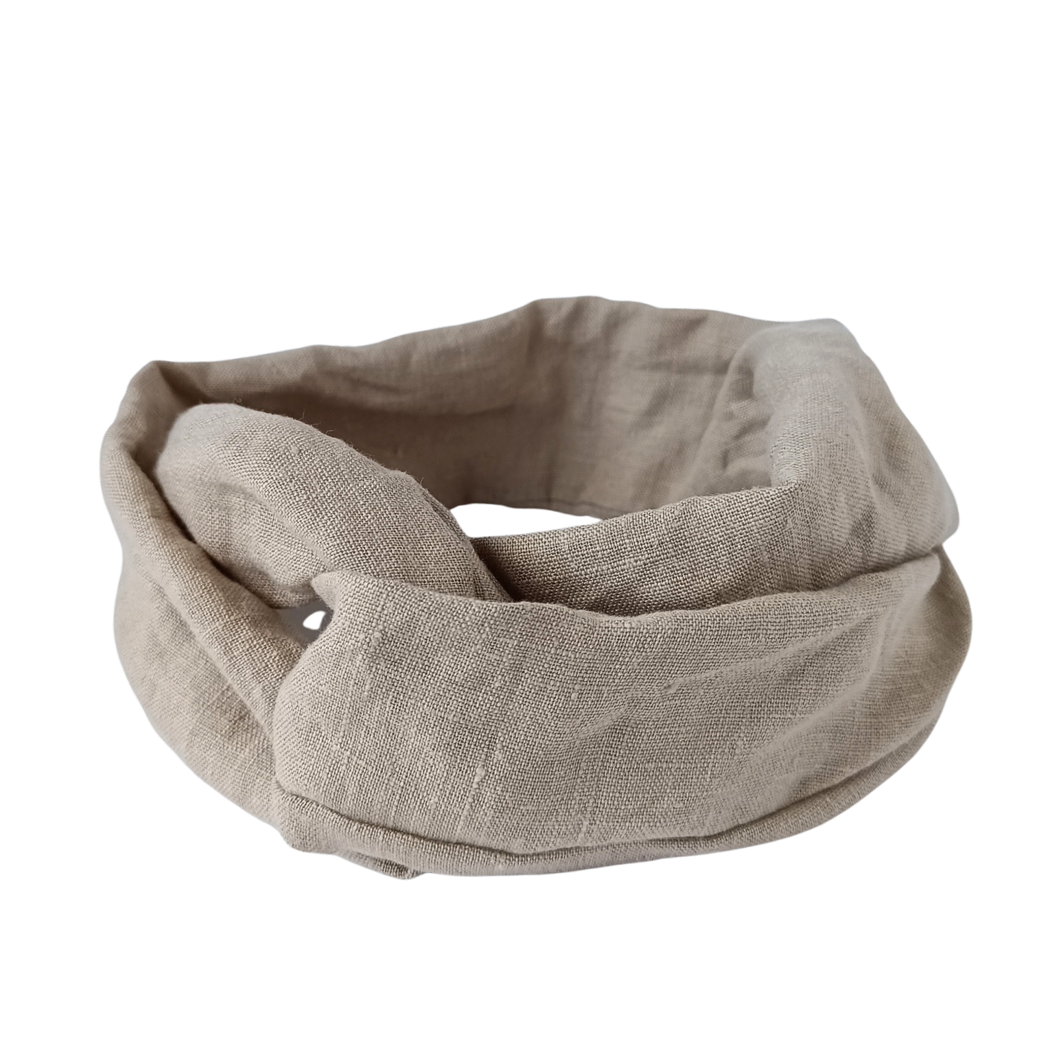 Deze haarband is gemaakt van een mooi linnen beige stof en bevat een dun, buigzaam draad aan de binnenkant. Daardoor kun je hem precies zo vormen als jij wilt: met een speelse knoop bovenop, als een klassieke strik, of juist strak en simpel naar achter gedragen.
